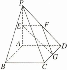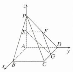 则$A(0,0,0)$,$B(2,0,0)$,$C(2,2,0)$,$D(0,2,0)$,$P(0,0,2)$,$E(0,0,1)$,$F(0,1,1)$,$G(1,2,0)$。所以$\overrightarrow{PB}=(2,0,-2)$,$\overrightarrow{FE}=(0,-1,0)$,$\overrightarrow{FG}=(1,1,-1)$,$\overrightarrow{BC}=(0,2,0)$,设$\boldsymbol{n}_{1}=(x_{1},y_{1},z_{1})$是平面$EFG$的法向量,则$\boldsymbol{n}_{1} \perp \overrightarrow{FE}$,$\boldsymbol{n}_{1} \perp \overrightarrow{FG}$,即$\begin{cases}\boldsymbol{n}_{1} \cdot \overrightarrow{FE}=0, \\ \boldsymbol{n}_{1} \cdot \overrightarrow{FG}=0, \end{cases}$得$\begin{cases}-y_{1}=0, \\ x_{1}+y_{1}-z_{1}=0, \end{cases}$令$z_{1}=1$,则$x_{1}=1$,$y_{1}=0$,所以平面$EFG$的一个法向量为$\boldsymbol{n}_{1}=(1,0,1)$。设$\boldsymbol{n}_{2}=(x_{2},y_{2},z_{2})$是平面$PBC$的法向量,则$\boldsymbol{n}_{2} \perp \overrightarrow{PB}$,$\boldsymbol{n}_{2} \perp \overrightarrow{BC}$,即$\begin{cases}\boldsymbol{n}_{2} \cdot \overrightarrow{PB}=2x_{2}-2z_{2}=0, \\ \boldsymbol{n}_{2} \cdot \overrightarrow{BC}=2y_{2}=0, \end{cases}$即$\begin{cases}y_{2}=0, \\ x_{2}-z_{2}=0, \end{cases}$令$z_{2}=1$,得$x_{2}=1$,$y_{2}=0$,所以平面$PBC$的一个法向量为$\boldsymbol{n}_{2}=(1,0,1)$。因为$\boldsymbol{n}_{1}=\boldsymbol{n}_{2}$,所以平面$EFG //$平面$PBC$。