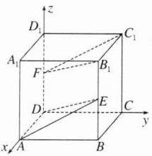 则$D(0,0,0)$,$A(2,0,0)$,$C_{1}(0,2,2)$,$E(2,2,1)$,$F(0,0,1)$,$B_{1}(2,2,2)$,所以$\overrightarrow{FC_{1}}=(0,2,1)$,$\overrightarrow{DA}=(2,0,0)$,$\overrightarrow{AE}=(0,2,1)$,$\overrightarrow{C_{1}B_{1}}=(2,0,0)$,设$\boldsymbol{n}_{1}=(x_{1},y_{1},z_{1})$是平面$ADE$的法向量,则$\boldsymbol{n}_{1} \perp \overrightarrow{DA}$,$\boldsymbol{n}_{1} \perp \overrightarrow{AE}$,即$\begin{cases}\boldsymbol{n}_{1} \cdot \overrightarrow{DA}=2x_{1}=0, \\ \boldsymbol{n}_{1} \cdot \overrightarrow{AE}=2y_{1}+z_{1}=0, \end{cases}$得$\begin{cases}x_{1}=0, \\ z_{1}=-2y_{1}。 \end{cases}$令$z_{1}=2$,则$y_{1}=-1$,所以平面$ADE$的一个法向量为$\boldsymbol{n}_{1}=(0,-1,2)$。同理,设$\boldsymbol{n}_{2}=(x_{2},y_{2},z_{2})$是平面$B_{1}C_{1}F$的法向量。由$\boldsymbol{n}_{2} \perp \overrightarrow{FC_{1}}$,$\boldsymbol{n}_{2} \perp \overrightarrow{C_{1}B_{1}}$,得$\begin{cases}\boldsymbol{n}_{2} \cdot \overrightarrow{FC_{1}}=2y_{2}+z_{2}=0, \\ \boldsymbol{n}_{2} \cdot \overrightarrow{C_{1}B_{1}}=2x_{2}=0, \end{cases}$解得$\begin{cases}x_{2}=0, \\ z_{2}=-2y_{2}。 \end{cases}$令$z_{2}=2$,得$y_{2}=-1$,所以平面$B_{1}C_{1}F$的一个法向量为$\boldsymbol{n}_{2}=(0,-1,2)$。因为$\boldsymbol{n}_{1}=\boldsymbol{n}_{2}$,即$\boldsymbol{n}_{1} // \boldsymbol{n}_{2}$,所以平面$ADE //$平面$B_{1}C_{1}F$。