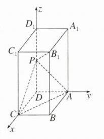 则 $C(1,0,0)$,$P(0,0,1)$,$A(0,1,0)$,$B_1(1,1,2)$。于是 $\overrightarrow{CA}=(-1,1,0)$,$\overrightarrow{CP}=(-1,0,1)$,$\overrightarrow{PB_1}=(1,1,1)$,所以 $\overrightarrow{CA}\cdot\overrightarrow{PB_1}=(-1,1,0)\cdot(1,1,1)=0$,$\overrightarrow{CP}\cdot\overrightarrow{PB_1}=(-1,0,1)\cdot(1,1,1)=0$,故 $\overrightarrow{CP}\perp\overrightarrow{PB_1}$,$\overrightarrow{CA}\perp\overrightarrow{PB_1}$,即 $PB_1\perp CP$,$PB_1\perp CA$,又 $CP\cap CA = C$,且 $CP\subset$ 平面 $PAC$,$CA\subset$ 平面 $PAC$,故直线 $PB_1\perp$ 平面 $PAC$。