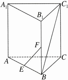 解:分别以直线$BC$,$BA$,$BB_1$为$x$,$y$,$z$轴,建立空间直角坐标系(如图)。设$AB = 1$,则$B(0,0,0)$,$E\left(0,\frac{1}{2},0\right)$,$F\left(0,0,\frac{1}{2}\right)$,$C_1(1,0,1)$,所以$\overrightarrow{EF}=\left(0,-\frac{1}{2},\frac{1}{2}\right)$,$\overrightarrow{BC_1}=(1,0,1)$。于是$\cos\langle\overrightarrow{BC_1},\overrightarrow{EF}\rangle=\frac{\overrightarrow{BC_1} \cdot \overrightarrow{EF}}{|\overrightarrow{BC_1}||\overrightarrow{EF}|}=\frac{\frac{1}{2}}{\sqrt{2} \times \frac{\sqrt{2}}{2}}=\frac{1}{2}$,所以直线$EF$和$BC_1$所成角的大小为$60^{\circ}$。