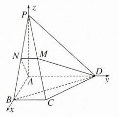 设$BC = 1$,则$A(0,0,0)$,$P(0,0,2)$,$B(2,0,0)$,$D(0,2,0)$,$C(2,1,0)$,$M\left(1,\frac{1}{2},1\right)$。所以$\overrightarrow{PB}=(2,0,-2)$,$\overrightarrow{DM}=\left(1,-\frac{3}{2},1\right)$,$\overrightarrow{AD}=(0,2,0)$,$\overrightarrow{DB}=(2,-2,0)$。