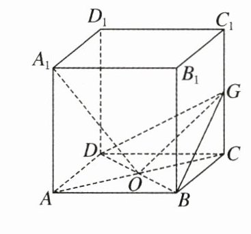 证明 设 $\overrightarrow{A_{1}B_{1}}=\boldsymbol{a}$,$\overrightarrow{A_{1}D_{1}}=\boldsymbol{b}$,$\overrightarrow{A_{1}A}=\boldsymbol{c}$,则 $\boldsymbol{a}\cdot\boldsymbol{b}=0$,$\boldsymbol{b}\cdot\boldsymbol{c}=0$,$\boldsymbol{a}\cdot\boldsymbol{c}=0$,$|\boldsymbol{a}| = |\boldsymbol{b}| = |\boldsymbol{c}|$。因为 $\overrightarrow{A_{1}O}=\overrightarrow{A_{1}A}+\overrightarrow{AO}=\overrightarrow{A_{1}A}+\frac{1}{2}(\overrightarrow{AB}+\overrightarrow{AD})=\boldsymbol{c}+\frac{1}{2}\boldsymbol{a}+\frac{1}{2}\boldsymbol{b}$,$\overrightarrow{BD}=\overrightarrow{AD}-\overrightarrow{AB}=\boldsymbol{b}-\boldsymbol{a}$,$\overrightarrow{OG}=\overrightarrow{OC}+\overrightarrow{CG}=\frac{1}{2}(\overrightarrow{AB}+\overrightarrow{AD})+\frac{1}{2}\overrightarrow{CC_{1}}=\frac{1}{2}\boldsymbol{a}+\frac{1}{2}\boldsymbol{b}-\frac{1}{2}\boldsymbol{c}$,所以 $\overrightarrow{A_{1}O}\cdot\overrightarrow{BD}=(\boldsymbol{c}+\frac{1}{2}\boldsymbol{a}+\frac{1}{2}\boldsymbol{b})\cdot(\boldsymbol{b}-\boldsymbol{a})=\boldsymbol{c}\cdot\boldsymbol{b}-\boldsymbol{c}\cdot\boldsymbol{a}+\frac{1}{2}\boldsymbol{a}\cdot\boldsymbol{b}-\frac{1}{2}\boldsymbol{a}^{2}+\frac{1}{2}\boldsymbol{b}^{2}-\frac{1}{2}\boldsymbol{b}\cdot\boldsymbol{a}=\frac{1}{2}(\boldsymbol{b}^{2}-\boldsymbol{a}^{2})=\frac{1}{2}(|\boldsymbol{b}|^{2}-|\boldsymbol{a}|^{2}) = 0$。所以 $\overrightarrow{A_{1}O}\perp\overrightarrow{BD}$,即 $A_{1}O\perp BD$。同理可证 $\overrightarrow{A_{1}O}\perp\overrightarrow{OG}$,即 $A_{1}O\perp OG$。又 $BD\cap OG = O$,所以 $A_{1}O\perp$ 平面 $GBD$。