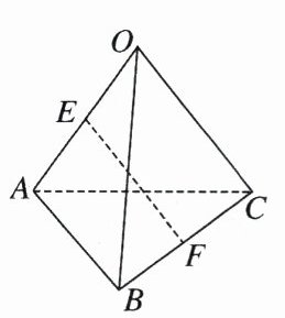 解 $\overrightarrow{EF}=\overrightarrow{EA}+\overrightarrow{AF}=\frac{1}{2}\overrightarrow{OA}+\frac{1}{2}(\overrightarrow{AB}+\overrightarrow{AC})=\frac{1}{2}\overrightarrow{OA}+\frac{1}{2}[(\overrightarrow{OB}-\overrightarrow{OA})+(\overrightarrow{OC}-\overrightarrow{OA})]=-\frac{1}{2}\overrightarrow{OA}+\frac{1}{2}\overrightarrow{OB}+\frac{1}{2}\overrightarrow{OC}$,所以 $\overrightarrow{EF}^{2}=\frac{1}{4}\overrightarrow{OA}^{2}+\frac{1}{4}\overrightarrow{OB}^{2}+\frac{1}{4}\overrightarrow{OC}^{2}+2\times(-\frac{1}{2})\times\frac{1}{2}\overrightarrow{OA}\cdot\overrightarrow{OB}+2\times(-\frac{1}{2})\times\frac{1}{2}\overrightarrow{OA}\cdot\overrightarrow{OC}+2\times\frac{1}{2}\times\frac{1}{2}\overrightarrow{OB}\cdot\overrightarrow{OC}=2$。所以 $|\overrightarrow{EF}|=\sqrt{2}$,即 $E$,$F$ 间的距离为 $\sqrt{2}$。