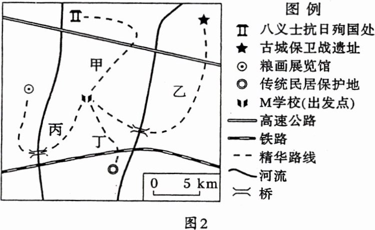 [典例1](2021·北京卷)我国某镇利用当地主产的粮食制作粮画,打造粮画小镇。图1是M学校设计的小镇地理位置指示牌,图2是该校设计的四条“行走的思政课”精华路线示意图。读图,完成(1)~(2)题。