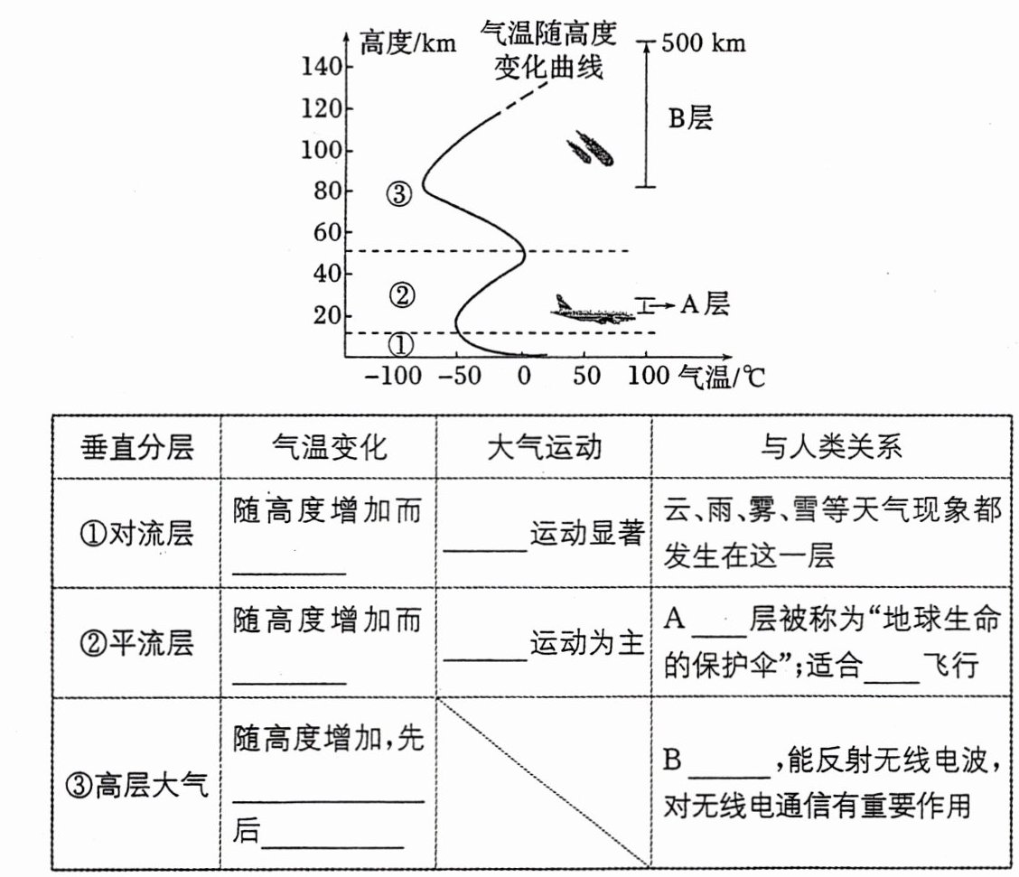 递减@@对流@@升高@@平流@@臭氧@@航空@@降@@升@@电离层