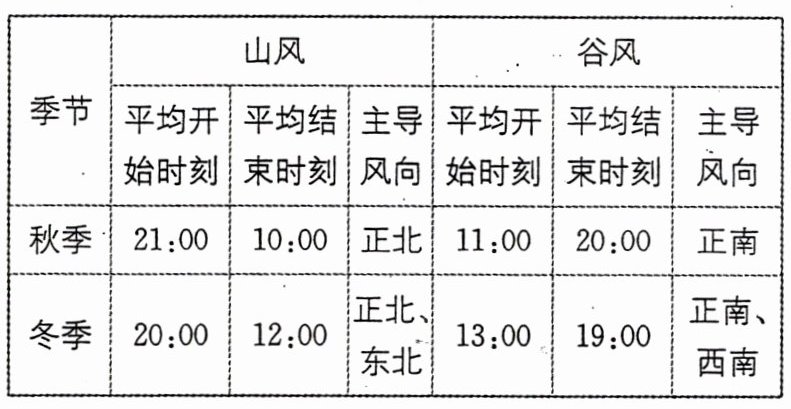 (2024·四川成都一诊)我国东部平原区特大城市与周边山地间常形成较为稳定的山谷风转换,下表为城市边缘某气象监测点测得的秋、冬季山谷风随时间的变化。据此完成 1~3 题。
