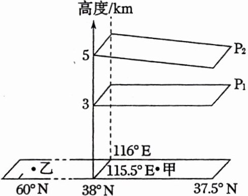 [典例](山东卷)下图为甲地所在区域某时刻高空两个等压面 P₁ 和 P₂ 的空间分布示意图,图中甲、乙两地经度相同。完成下题。