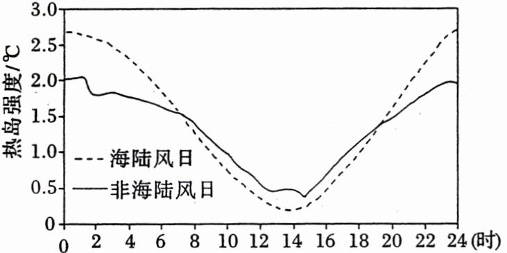 (2024·河北邯郸开学考试)城市热岛强度为城区平均温度与其周边郊区平均温度的差值,造成城区气温高于周围郊区气温的现象被称为城市热岛效应。下图为我国东南沿海的某城市海陆风日与非海陆风日的热岛强度日变化图。据此完成 3~4 题。