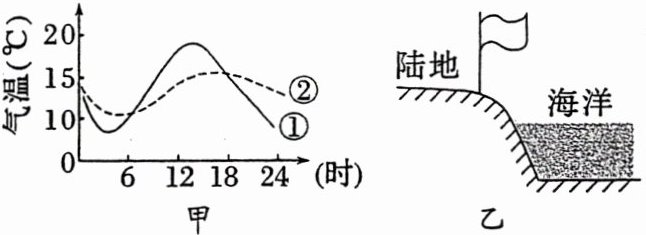(2024·山东济南期中)下面图甲为“某滨海地区陆地和海洋表面气温日变化曲线图”,图乙为“旗帜主要飘动方向示意图”。据此完成 1~2 题。
