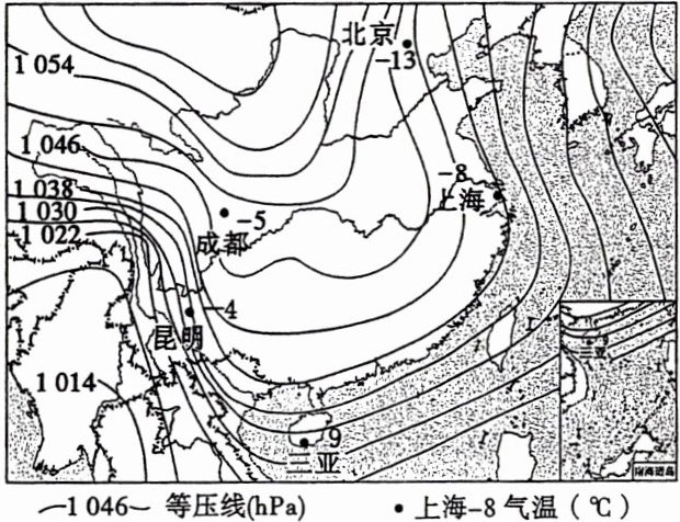 [典例] (江苏卷)2021 年 1 月 24 日,一股强大的寒潮影响我国。下图为该日 8 时亚洲部分地区海平面气压形势图。读图回答下题。