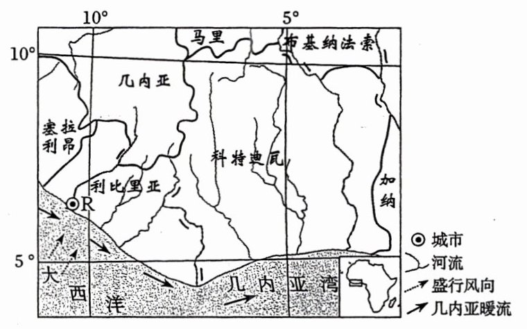 几内亚湾是非洲最大的海湾,沿岸有十余个国家。下图示意几内亚湾西部沿岸部分地区。