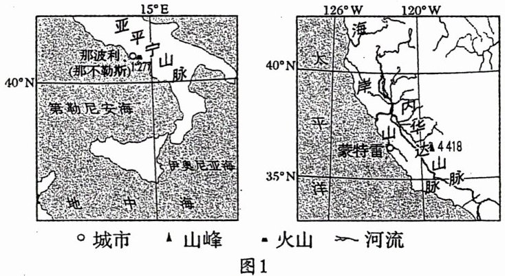 图1为意大利那波利和美国蒙特雷的地理位置图。图2为意大利那波利和美国蒙特雷的气候资料。