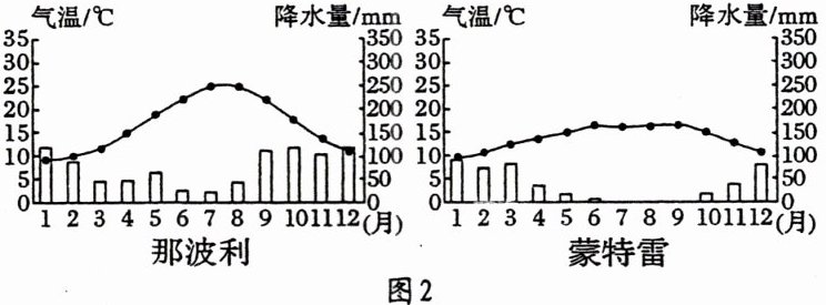 比较那波利和蒙特雷气候特点的不同,并分析其原因。(10分)