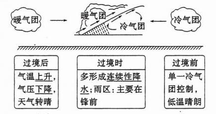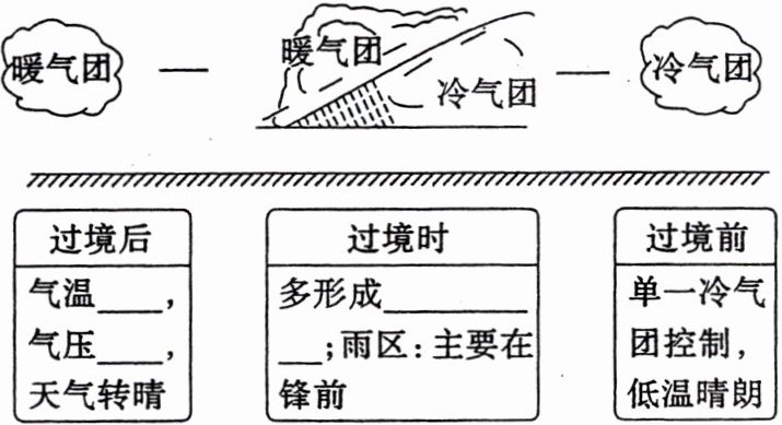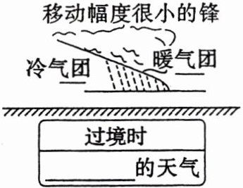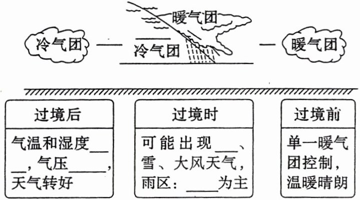 ②天气:请在下图中用箭头标注冷、暖气团的运动,并把天气现象补充完整。