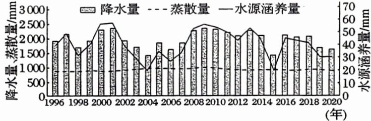 (2023·海南卷)水源涵养是指生态系统通过其特有结构与水相互作用,将水分保持在生态系统的过程与功能。海南岛降水量呈现东部多、西部少的特点。下图示意 1996~2020 年海南岛降水量、蒸散量、水源涵养量的年际变化。据此完成 1~2 题。