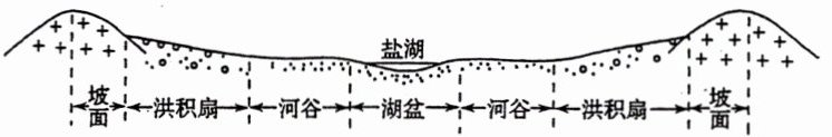 [典例](全国Ⅰ卷)下图示意我国西北某闭合流域的剖面。该流域气候较干,年均降水量仅为 210 毫米,但湖面年蒸发量可达 2 000 毫米。湖水浅,盐度饱和,水下已形成较厚盐层。据此完成(1)~(2)题。