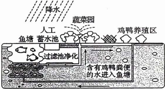 (2024·南京市调研)浙江宁波的甬城不用化肥、不用农药、不用除草剂、不用生长激素的“四不用”农场利用人工蓄水池进行蓄水,通过引水渠流入蔬菜园进行灌溉,再流经养鸭的水禽区和养鸡区,含有鸡鸭粪便的水最后进入鱼塘,作为鱼的饲料。鱼塘的水通过过滤池净化后,又重新用来灌溉,从而形成一个完整的水循环过程。下图为“四不用”农场示意图。据此完成 3~4 题。