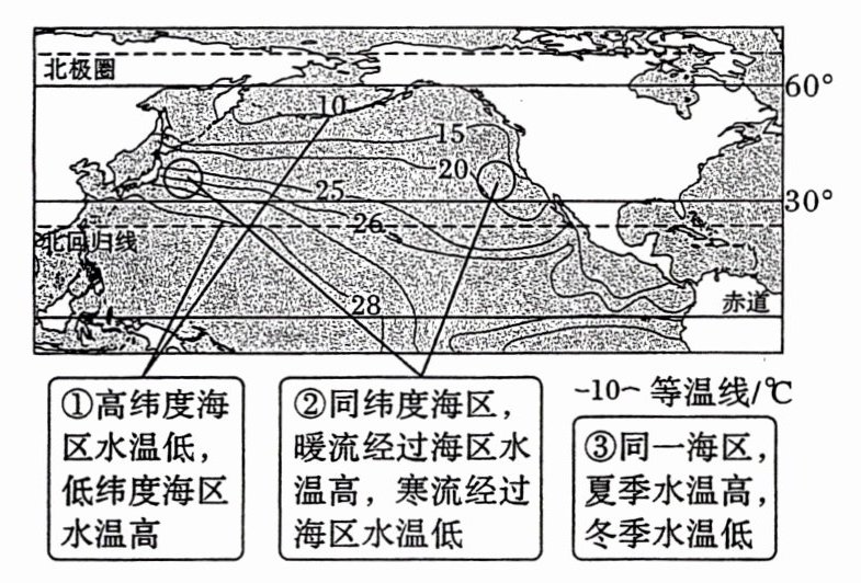(1)海洋表层水温分布规律,如下图8月份北半球海洋表层水温分布示意图。