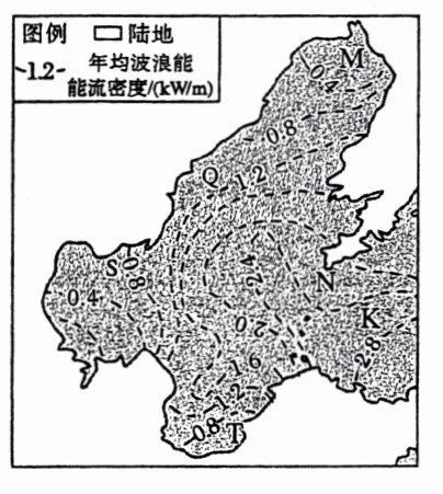 (2024·山东省实验中学高三月考)波浪能是一种新能源,我国海域辽阔,波浪能资源丰富。波浪能发电有广阔的发展前景,但目前尚处于试验阶段。右图示意我国渤海海域波浪能能流密度的空间分布。据此完成 1~3 题。