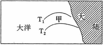 下图为某沿海地区,图中T₁、T₂为甲洋流流经区域等温线的分布状况。读图,完成1~2题。