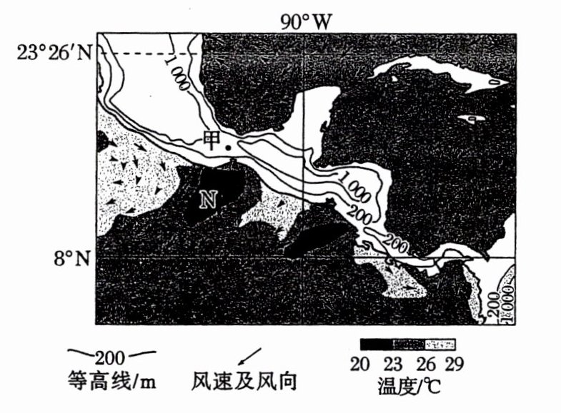 冬半年,美洲中部地区频繁受冷空气影响。下图示意2000年1月一次冷空气南下过程中,美洲中部附近海洋表层风场和海平面气温分布。甲处南北两侧的气压梯度较大。