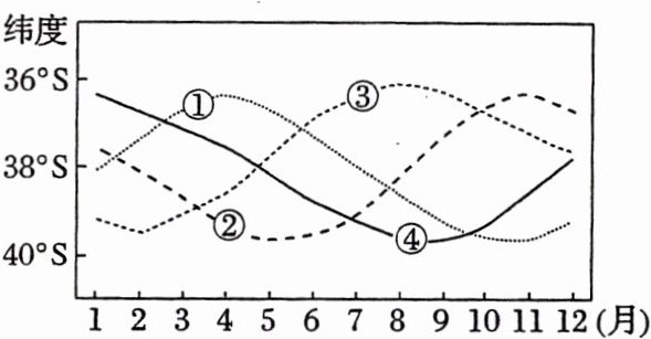 3. 下图中反映北上寒流和巴西暖流交汇处纬度位置年内变化的曲线是( )