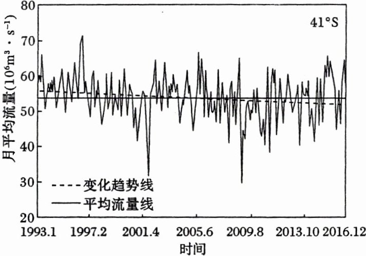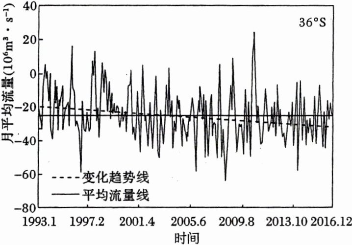 (2023·江苏卷)西风漂流绕过南美大陆南端后部分向北形成北上寒流,与巴西暖流交汇后东流。下图为“1993~2016年西南大西洋海区36°S和41°S附近两个截面逐月洋流流量及变化趋势图”(数值表示流量大小;正负表示流向,北向为正,南向为负)。据此完成1~3题。