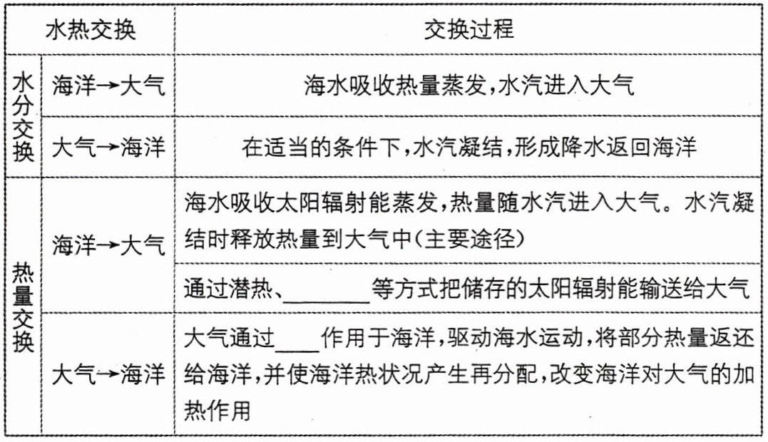 1.海—气相互作用,进行________交换,构成地球上生生不息的水循环。地球上的水时时刻刻都在循环运动,从长期来看,全球的总水量没有什么变化。