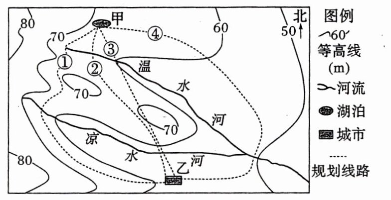 3. 在我国古代,计划将甲湖泊的水引到乙城市,适宜的调水线路是( )