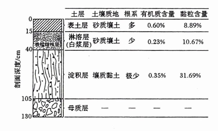 白浆化棕壤是指在土壤表层以下存在白浆层的棕壤,白浆层底部常见坚硬的铁锰结核层。白浆化棕壤分布区地下水位较低,年降水量 800~950 mm,降水主要集中于 6~9 月。目前,白浆化棕壤大部分被辟为农田,以种植花生、地瓜、冬小麦为主,是低产土壤之一。下图示意白浆化棕壤的剖面构型及各土层主要理化性质。