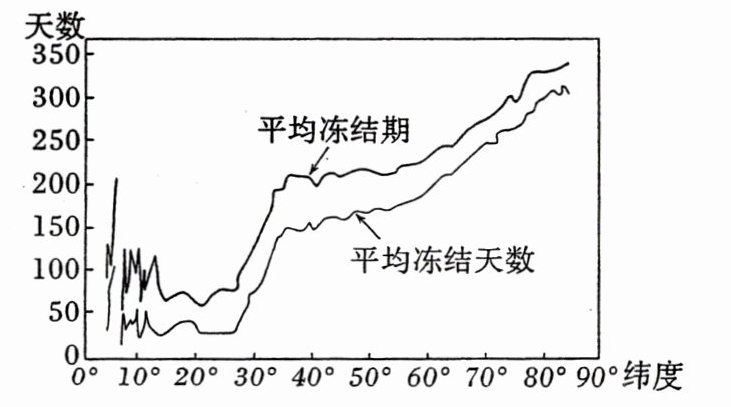 (2022·福建卷)冻结期是指一年内土壤冻结第一天至冻结最后一天的天数,冻结天数是指一年内土壤发生冻结的所有天数。由于冻结期内土壤并非每天都会冻结,因而冻结期往往大于冻结天数。下图示意 1981~2010 年北半球土壤平均冻结期和平均冻结天数随纬度的变化。据此完成 1~3 题。