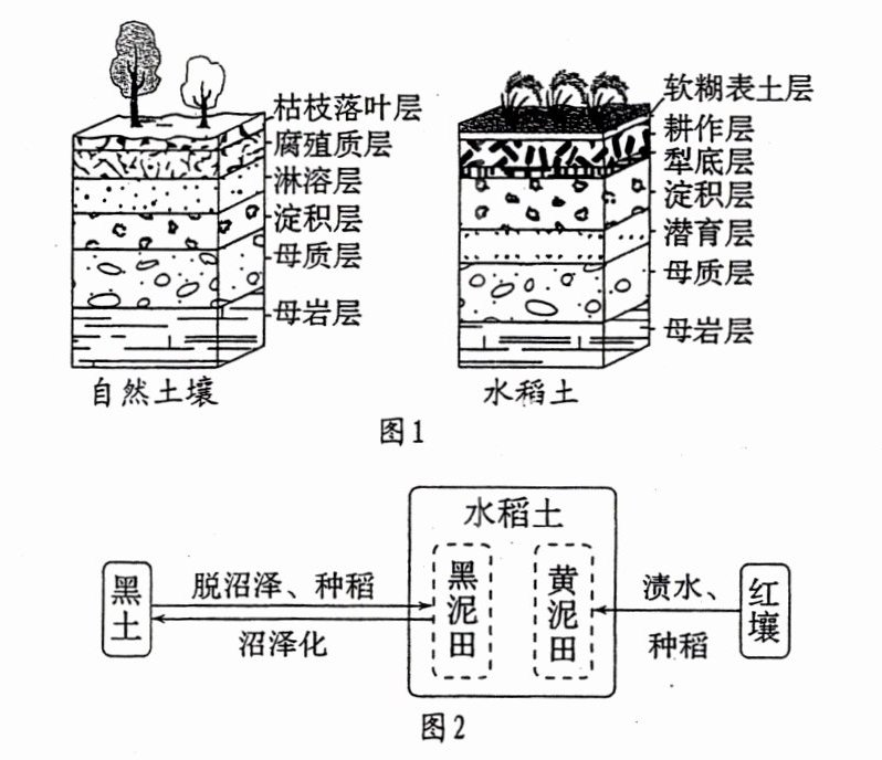 (2024·重庆八中开学考试)熟化是通过耕种、定向培育,将自然土壤转变成适合农作物生长且肥沃的土壤的过程。我国东北的黑土、南方的红壤经熟化都可成为水稻土。图 1 为自然土壤与水稻土结构示意图,图 2 为黑土、红壤和水稻土关系示意图。据此完成 1~3 题。