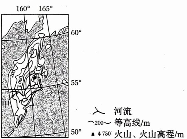 某科考队 8 月考察堪察加半岛, 考察中发现, 堪察加半岛北部发育苔原, 南部生长森林; 东西向气候区域差异显著; 大型植食性和肉食性野生动物数量较少, 但冬眠杂食性且善捕鱼的熊的数量较多; 大量来自海洋的鲑鱼溯河流而上, 成为熊的重要食物。下图示意堪察加半岛的地形。