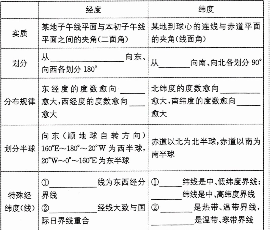(1)概念:在地球仪上,经线和纬线相互交织而成的网络。