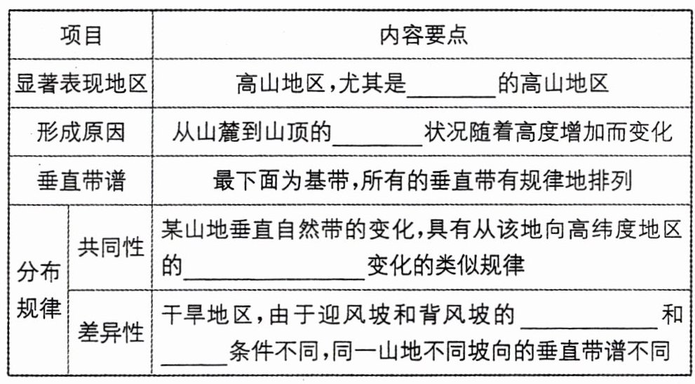 $3. $分布特点:从山麓到山顶出现由下而上随$_____$延伸逐渐变化更迭。