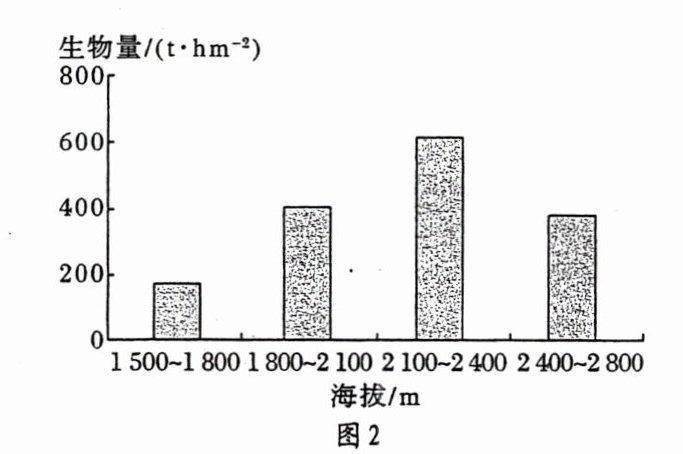 天山中山带海拔 1 600~2 800 m 之间分布有带状的雪岭云杉林,研究人员通过考察云杉林带生物量积累的具体过程和影响因素,获得天山雪岭云杉林带生物量随海拔的变化(如图 2),并发现自西南向东北天山雪岭云杉林带生物量呈降低趋势。