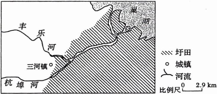 圩田是在低洼地筑堤围出的田地。下图所示圩田海拔 6~7 米,种植庄稼;巢湖多年平均水位 8.03 米。据记载,在清朝嘉庆年间,三河镇濒临巢湖。