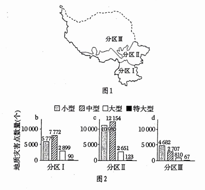 (2024·河北联考)青藏高原及横断山区位于中国西南部,地貌类型复杂,地壳运动活跃。在气候及地质活动的双重作用下,该区域内泥石流、崩塌及滑坡等地质灾害频发。图 1 为青藏高原及横断山区地质灾害易发分区图,图 2 为各分区不同规模地质灾害分级统计图。据此完成 6~7 题。