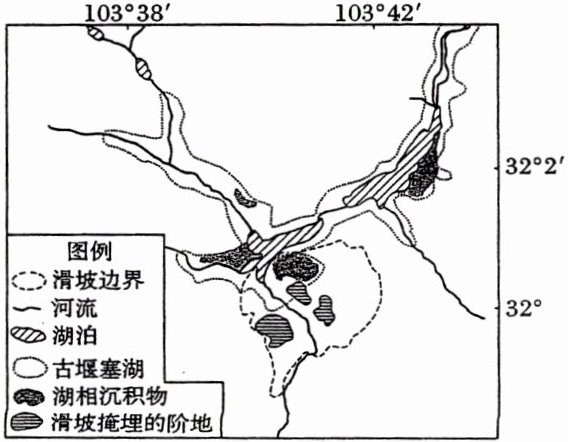 我国西南某地地质时期发生过一次大型滑坡,滑坡体堵江后形成了大型古堰塞湖。古堰塞湖从形成到溃坝后,滑坡体上、下游水文特征变化显著,对河床地貌演化产生了深远的影响。下图为“当地古堰塞湖、滑坡位置示意图”,图中滑坡边界内含滑坡源区和堆积区。据此完成 3~5 题。