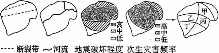 B [分析数据、制作地图需要的是 GIS 技术,B 项正确。]@@D [据图分析,甲、乙、丙三地均位于地震破坏程度和次生灾害频率的中高区域,不适合建城市,丁地位于地震破坏程度最低的区域,且次生灾害少、远离断裂带,从地质安全和城市发展角度考虑,该城市最适宜建在丁地,D 项正确。]