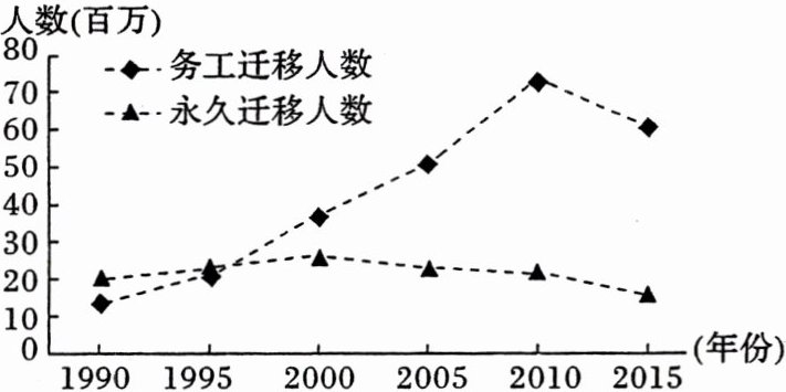[典例] (2021·湖南卷)永久迁移是指户籍发生改变的人口迁移类型;务工迁移是指离开户籍地外出务工的人口迁移类型(不包括永久迁移)。下图示意1990~2015年我国人口迁移的数量变化,图中永久迁移人数为每五年的累积数量,务工迁移人数为当年的数量。据此完成(1)~(2)题。