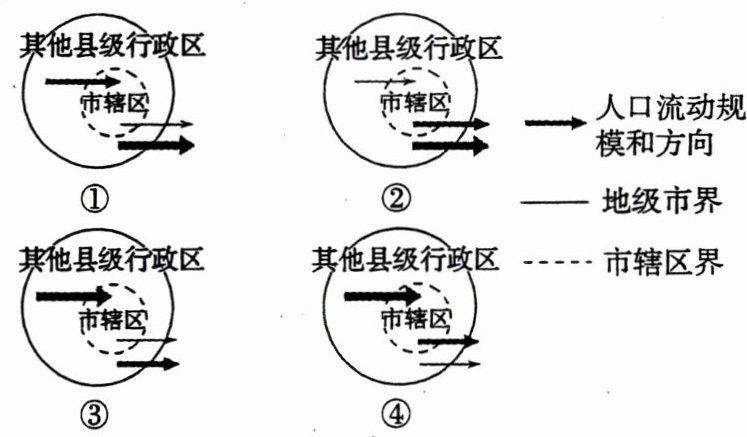 3. A [读图对比2020年和2010年的市辖区人口和其他县级行政区常住人口数量可知,市辖区人口增加,但增幅较小,其他县级行政区人口减少,减幅较大,总人口明显减少。因此人口流动情况为其他县级行政区人口少部分流向市辖区,较多人口流出该地级市。而市辖区流出地级市的人口应少于其他县级行政区流入市辖区的人口,图中箭头粗细可以表示人口流动量的大小,①图符合题意,A正确;②图市辖区流出地级市的人口多于其他县级行政区流入市辖区的人口,会造成市辖区人口减少,不符合题意,B错误;③和④其他县级行政区流入市辖区的人口远高于流出地级市的人口,不符合题意,C、D错误。故选A。]