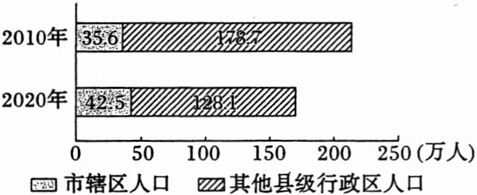 (2023·山东卷)我国地级市一般由市辖区和其他县级行政区组成。下图示意我国某地级市2010年和2020年的常住人口数量。该市的常住人口变化状况在全国具有一定的代表性。据此完成3~5题。