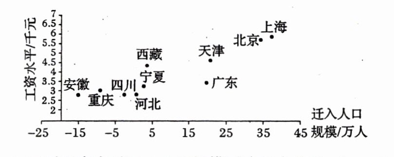 (2024·贵州贵阳调研)如图是我国部分省级行政区某时期迁入人口规模与工资水平相关性示意图(图中数据越大,表示规模越大,水平越高)。读图,完成6~8题。