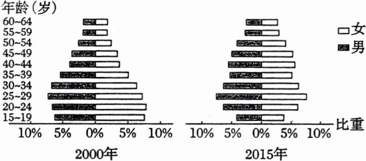 (2021·1月浙江卷)2000年到2015年,广东省劳动年龄人口增加了约2千万。下图为该省2000年、2015年劳动年龄人口金字塔图,完成4~5题。