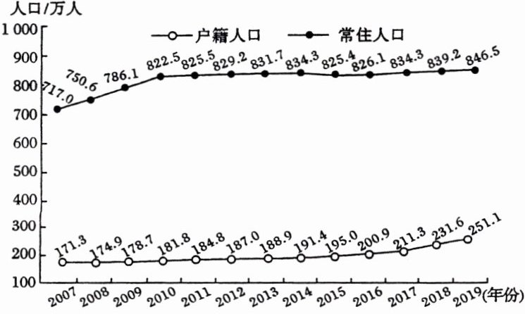 (2021·山东卷)下图示意我国某地级市2007~2019年户籍人口和常住人口的变化情况。读图,完成1~3题。
