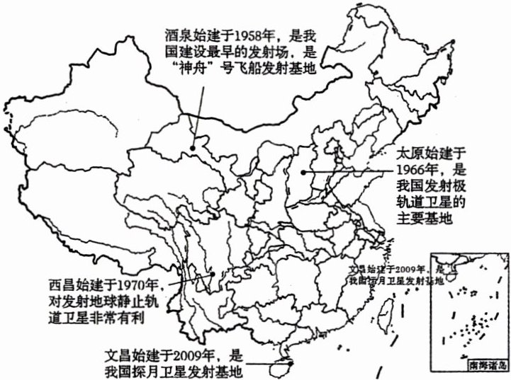 材料二 2014年10月,文昌航天发射场竣工,它是中国首个滨海发射基地,也是世界上为数不多的低纬度发射场之一。下图示意中国四大航天发射基地位置。