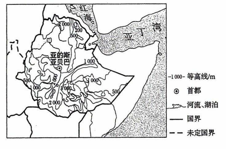 (1)题,读图可知,埃塞俄比亚地形条件为“以高原山地为主,地势起伏大”,据此可以得出“土地坡度大,不利于灌溉”的结论。结合区域地理背景知识,特别是区域气候类型,可知埃塞俄比亚以热带草原气候、高原山地气候为主。因此,其水资源条件为“大部分地区降水较多,但季节分配不均”。同时,结合地形图,可以推知该国“河湖多,地表水资源较丰(东非水塔),但空间分布不均”。第
