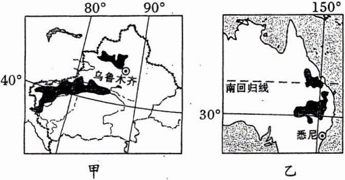 读我国新疆棉花分布示意图(图甲)和澳大利亚棉花分布示意图(图乙),完成1~3题。