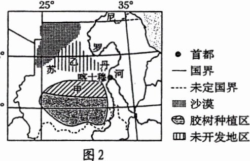 苏丹阿拉伯胶由胶树分泌形成,广泛应用于食品、医药、化妆品等领域。胶树扎根较深,能大量吸收地下水,最适宜生长在雨季短、旱季长的热带地区。胶树种植 5 年后方可采胶,每年 10 月份出胶,一年内仅能收胶 3 次,主要依靠人工采胶。苏丹阿拉伯胶产量和出口量均居世界首位。近年来,苏丹阿拉伯胶在国际市场上供不应求,但该国却遇到了苏丹阿拉伯胶增产难度大的问题。图 1 为胶树景观图,图 2 为苏丹阿拉伯胶树种植区分布示意图,其中甲区域是该国胶树最适宜的生长区。